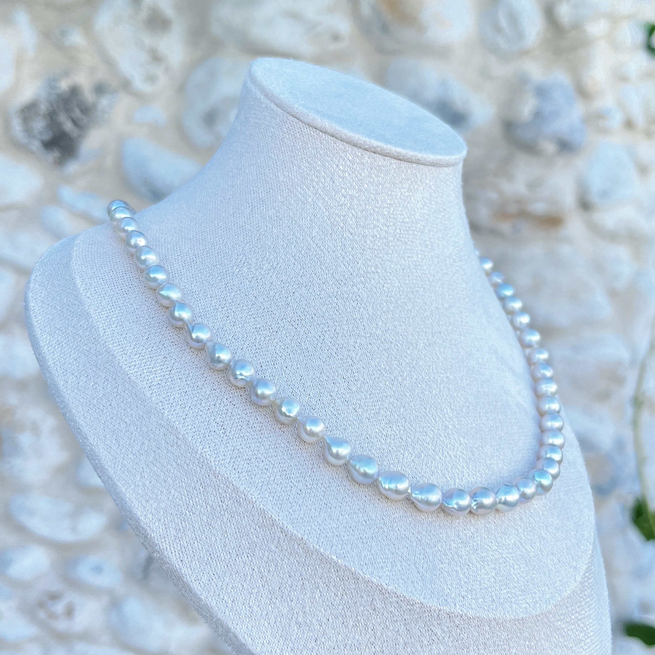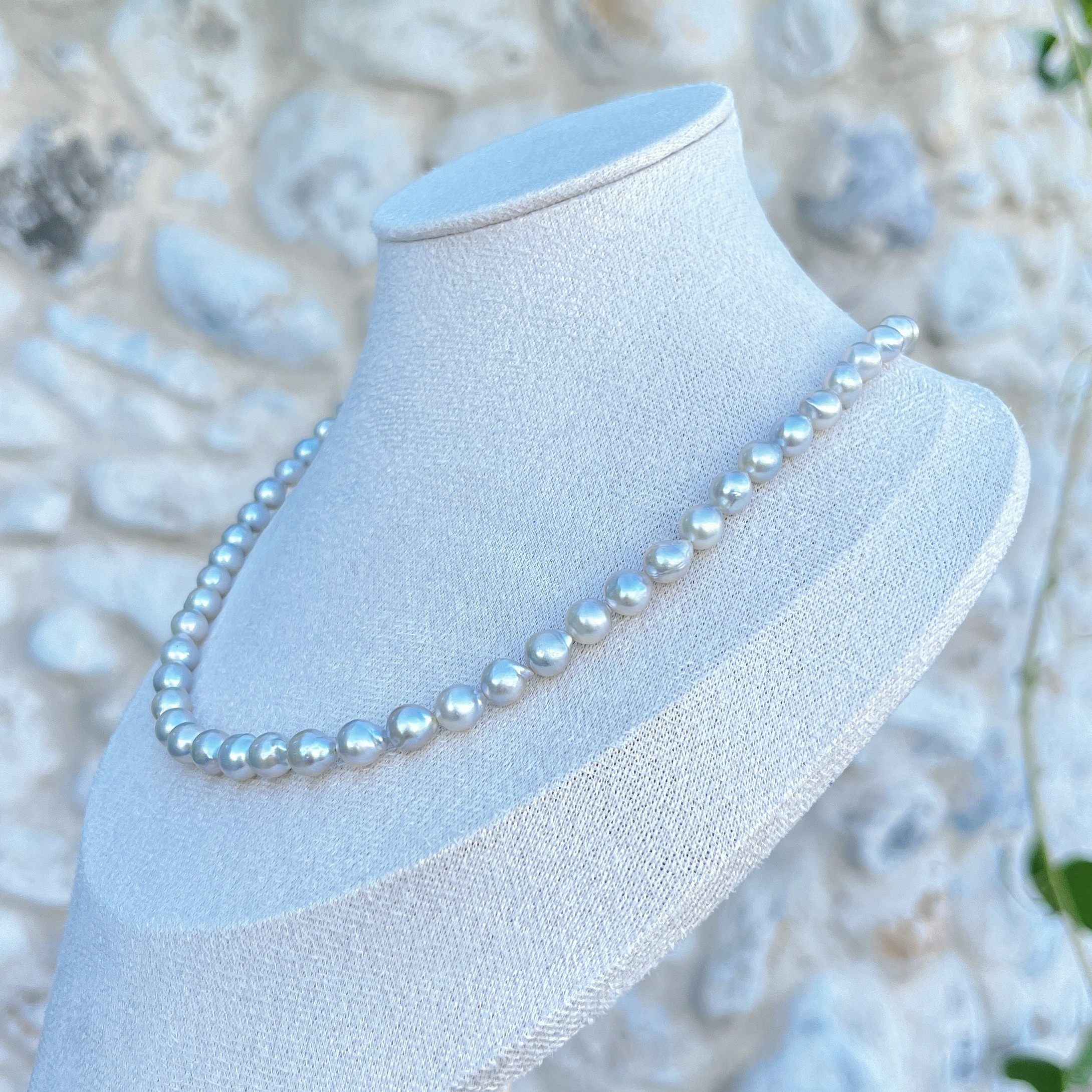 This necklace is composed of natural Japanese Akoya baroque pearls, selected for their soft silver-grey toning and refined luster. Each pearl carries its own organic character, creating a subtle rhythm along the strand while maintaining an elegant overall balance.