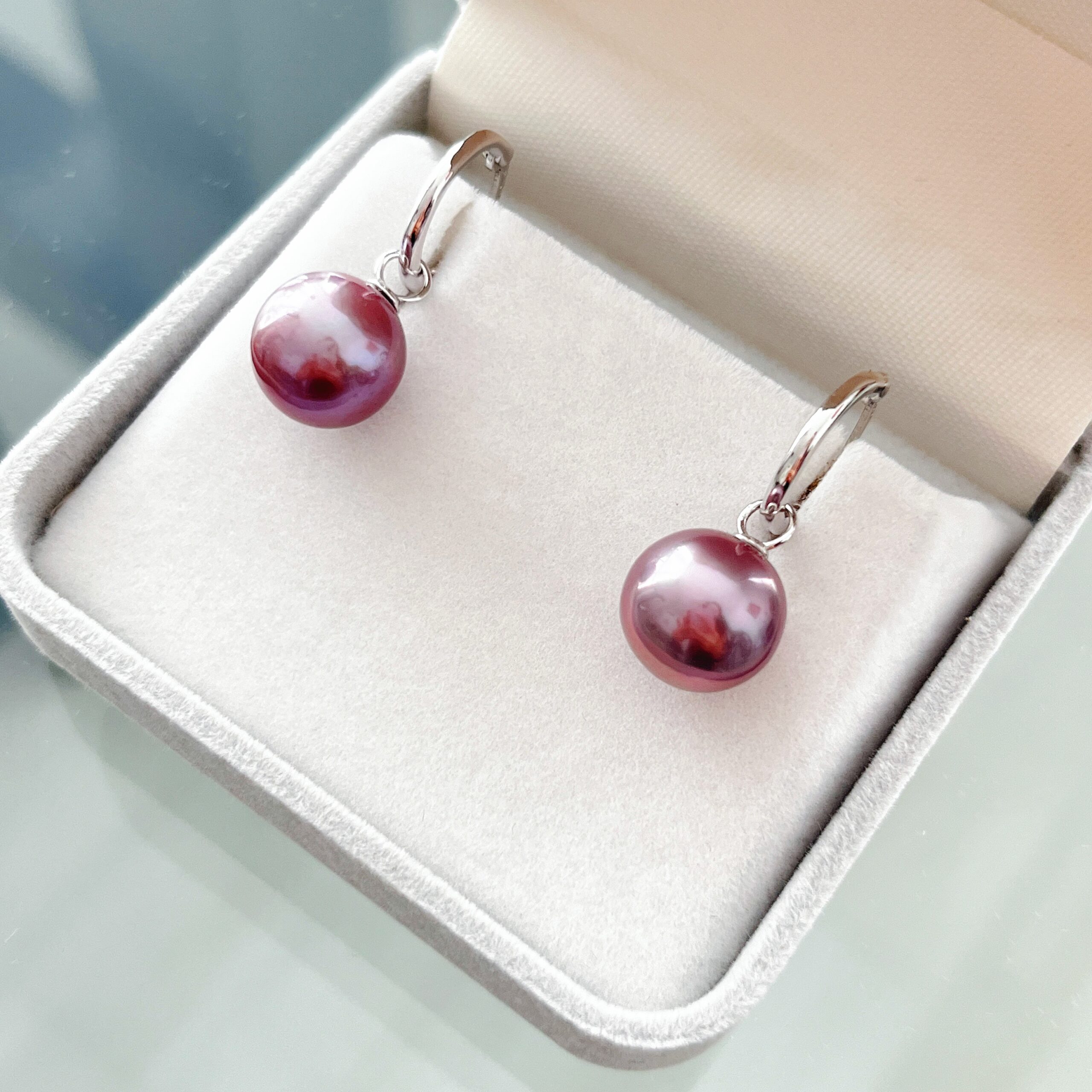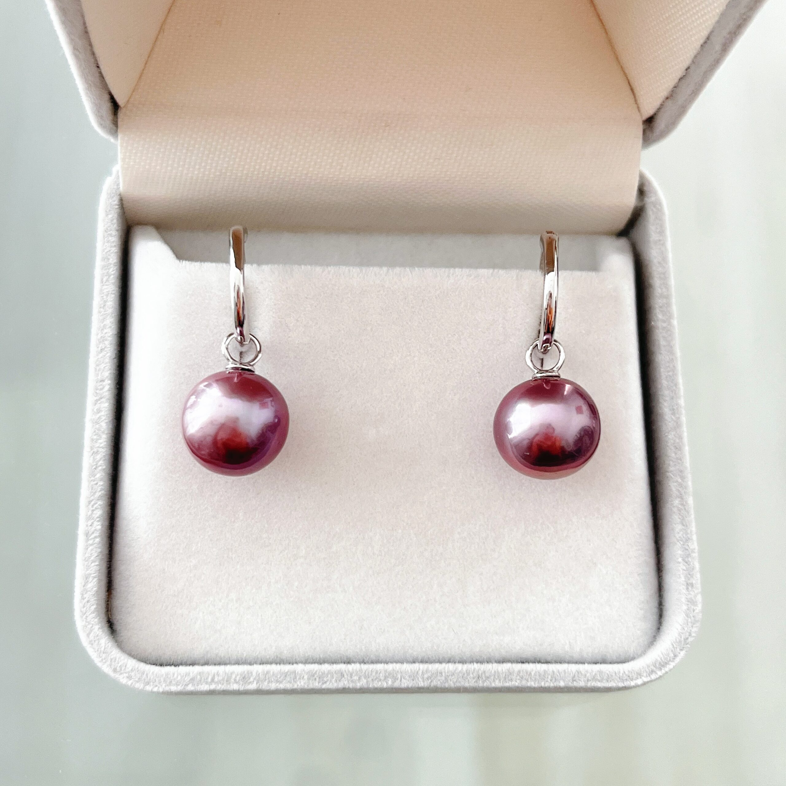 Graceful and captivating, the Amethyst Glow earrings showcase the natural beauty of 10–11mm freshwater pearls with a soft, natural purple toning that radiates elegance. Each pearl is perfectly round and possesses a mirror-like luster, reflecting light with exceptional depth and warmth.