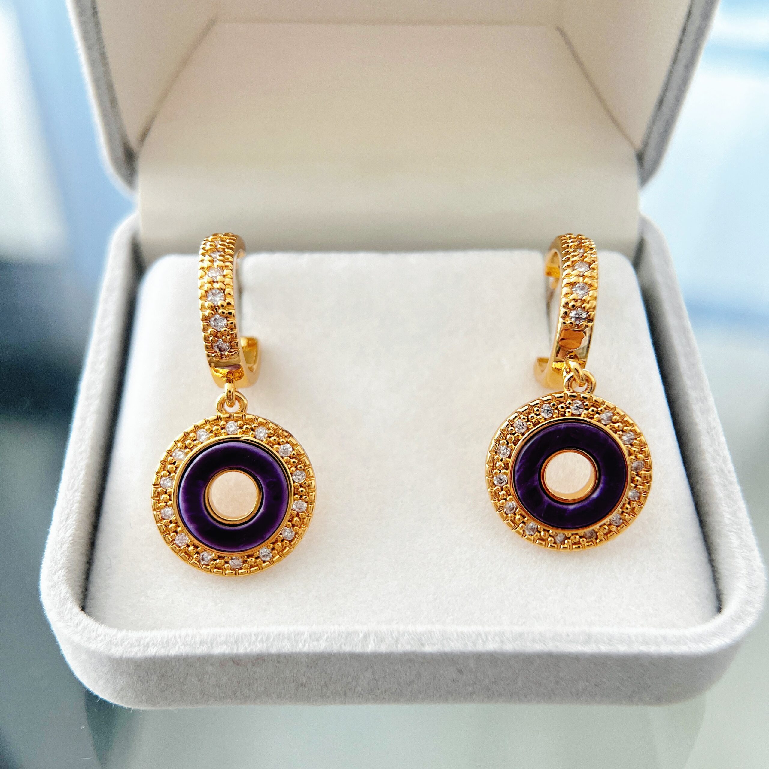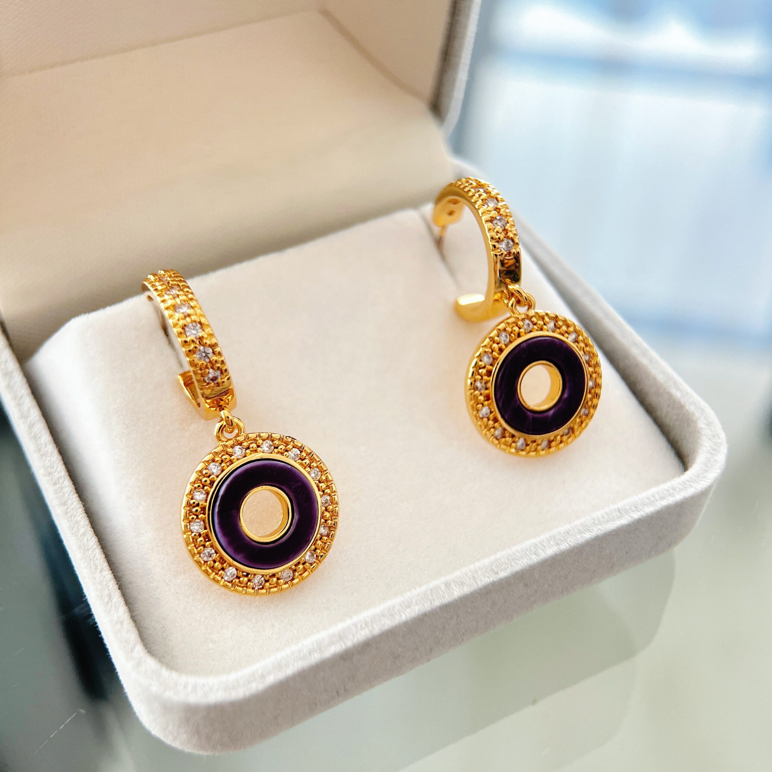 The rich purple tone adds depth and individuality, while the circular silhouette symbolizes continuity and strength. Designed to move gently with you, these earrings catch the light beautifully — refined enough for evening wear, yet striking for elevated daytime styling.