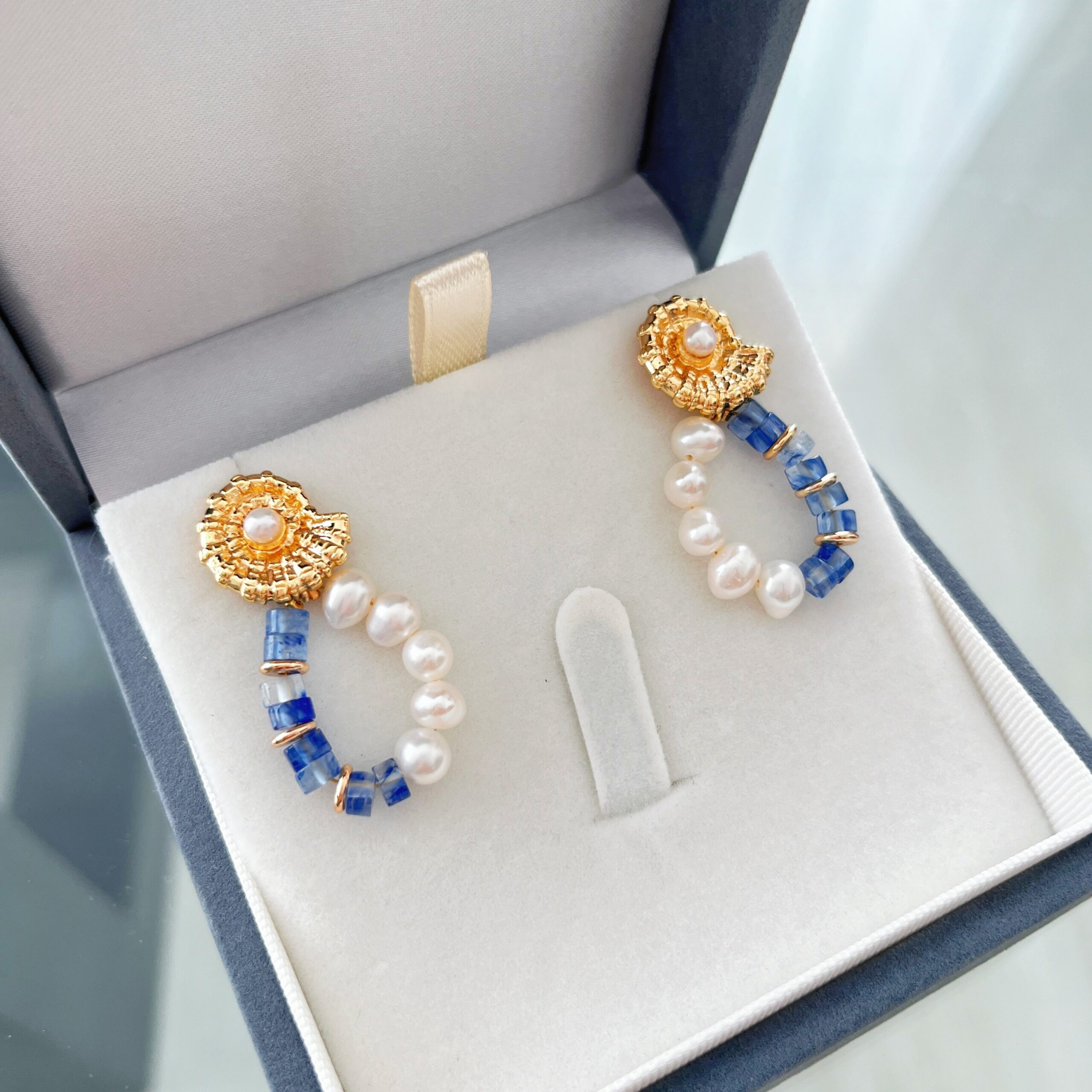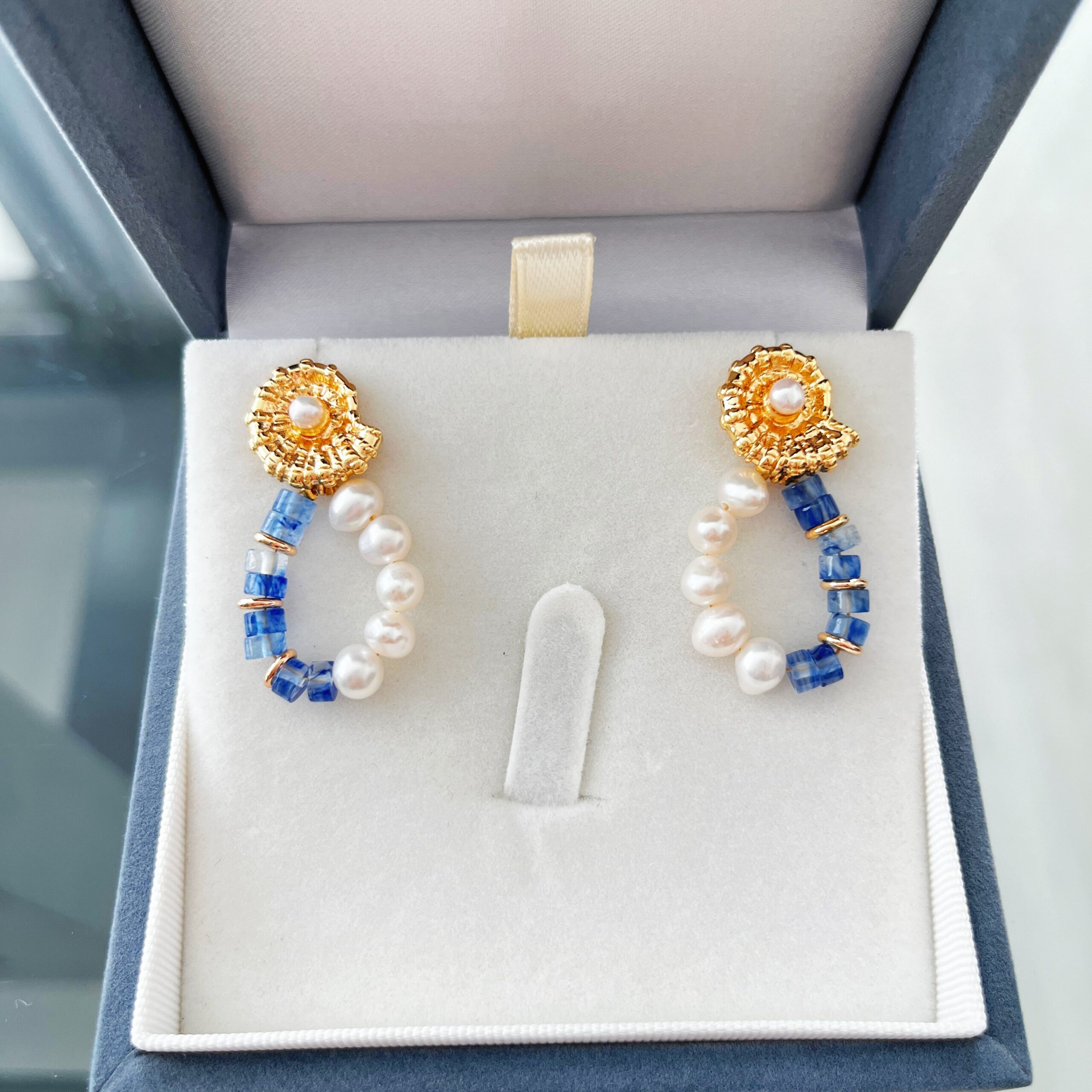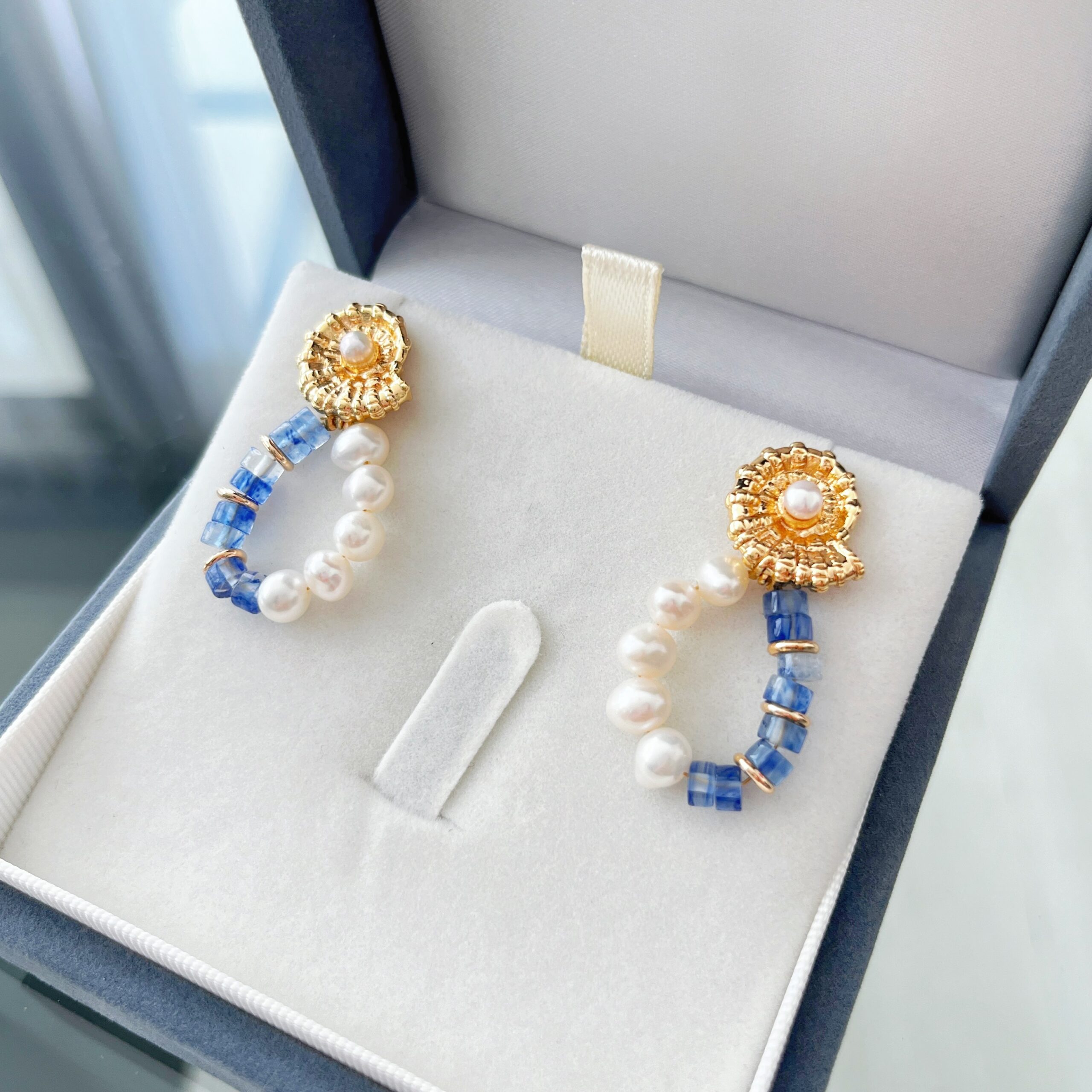 Below the stud, a delicate loop of natural pearls pairs beautifully with faceted blue agate, creating an elegant contrast between soft iridescence and vivid color. Crafted with silver needles, these earrings are comfortable, lightweight, and perfect for both special occasions and uplifting everyday looks.