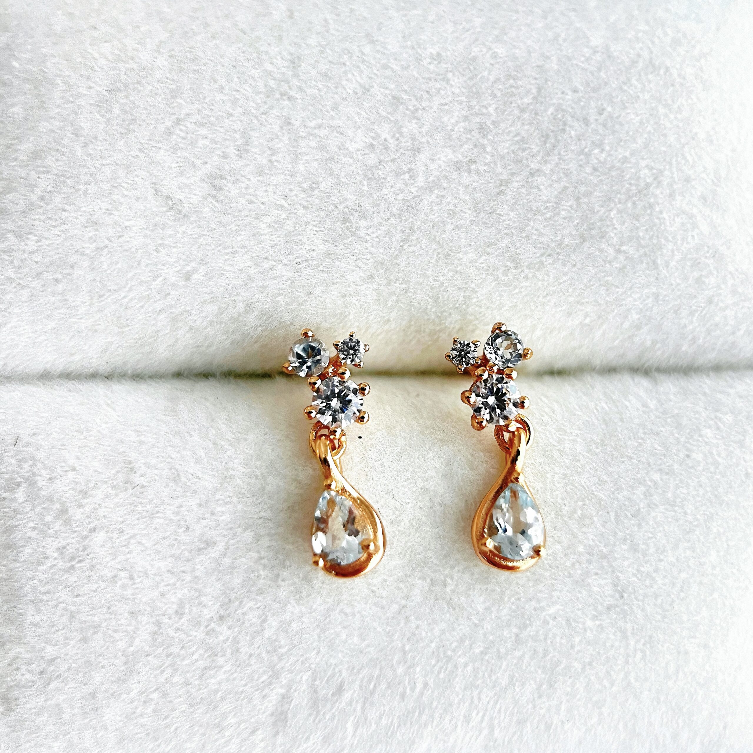 Set in a gold-toned frame with S925 sterling silver needles, the design features a gentle teardrop silhouette suspended beneath a trio of sparkling stones — creating a balance of shimmer and serenity. Though small in size, their craftsmanship reveals exceptional attention to detail, making them an exquisite accent for both everyday wear and elegant occasions.