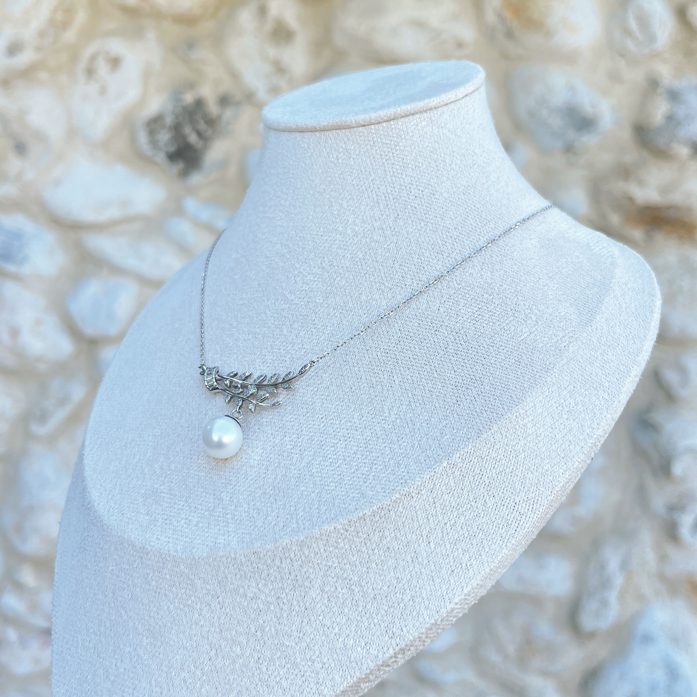 Inspired by the laurel branch—an ancient emblem of victory and elegance—this necklace features a shimmering pavé branch holding a luminous 9–10 mm freshwater pearl. The design sits beautifully on the neckline, adding refined movement and a soft glow.