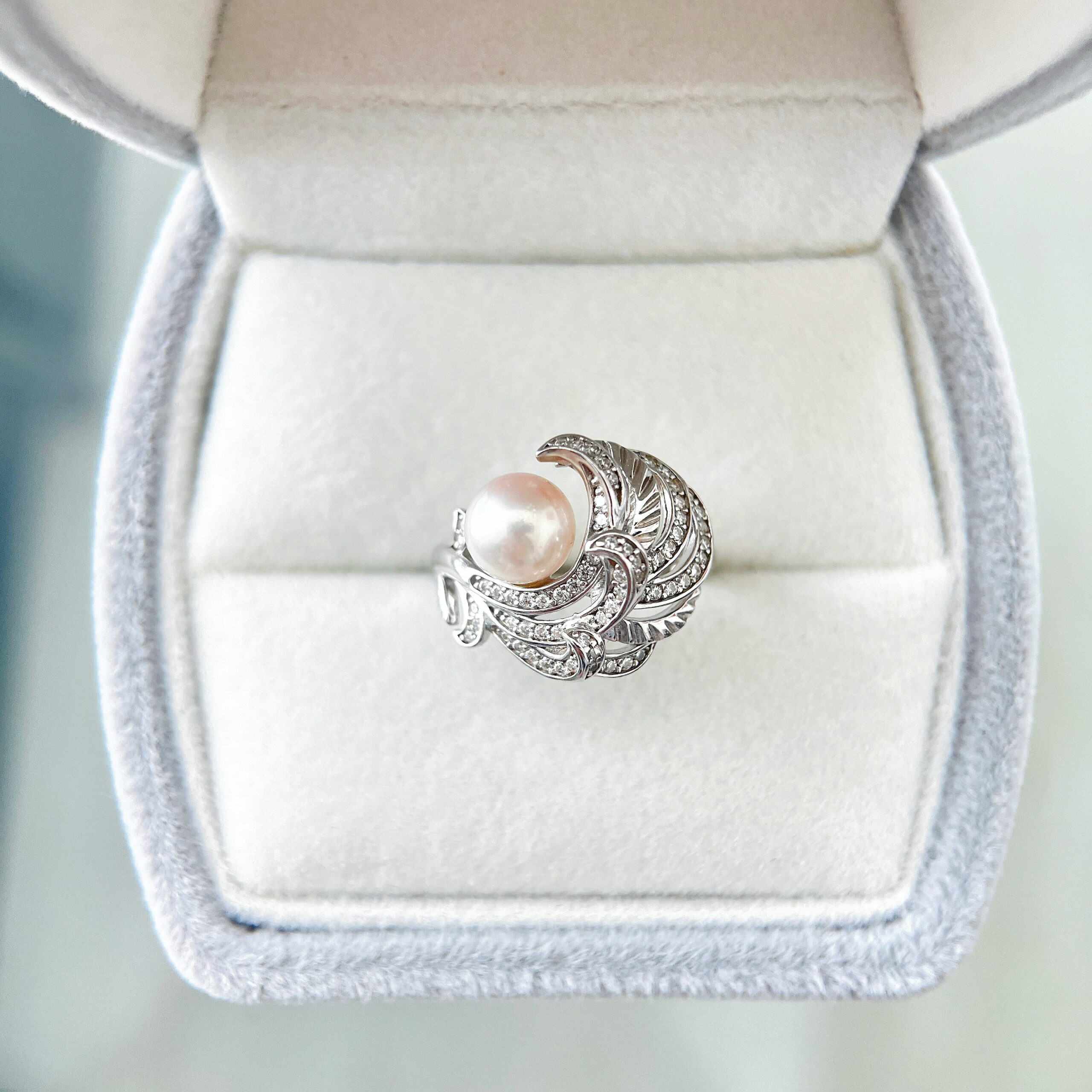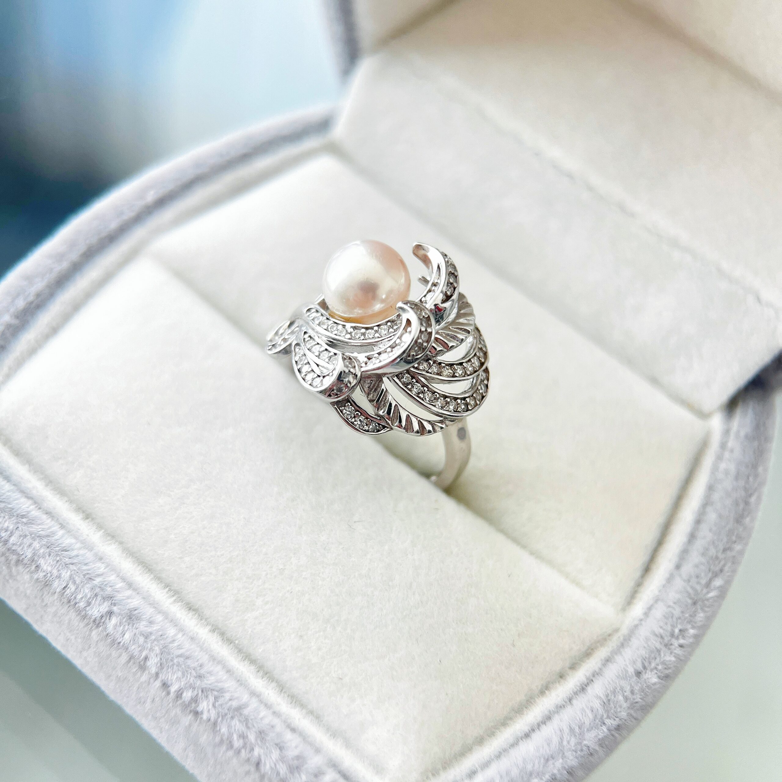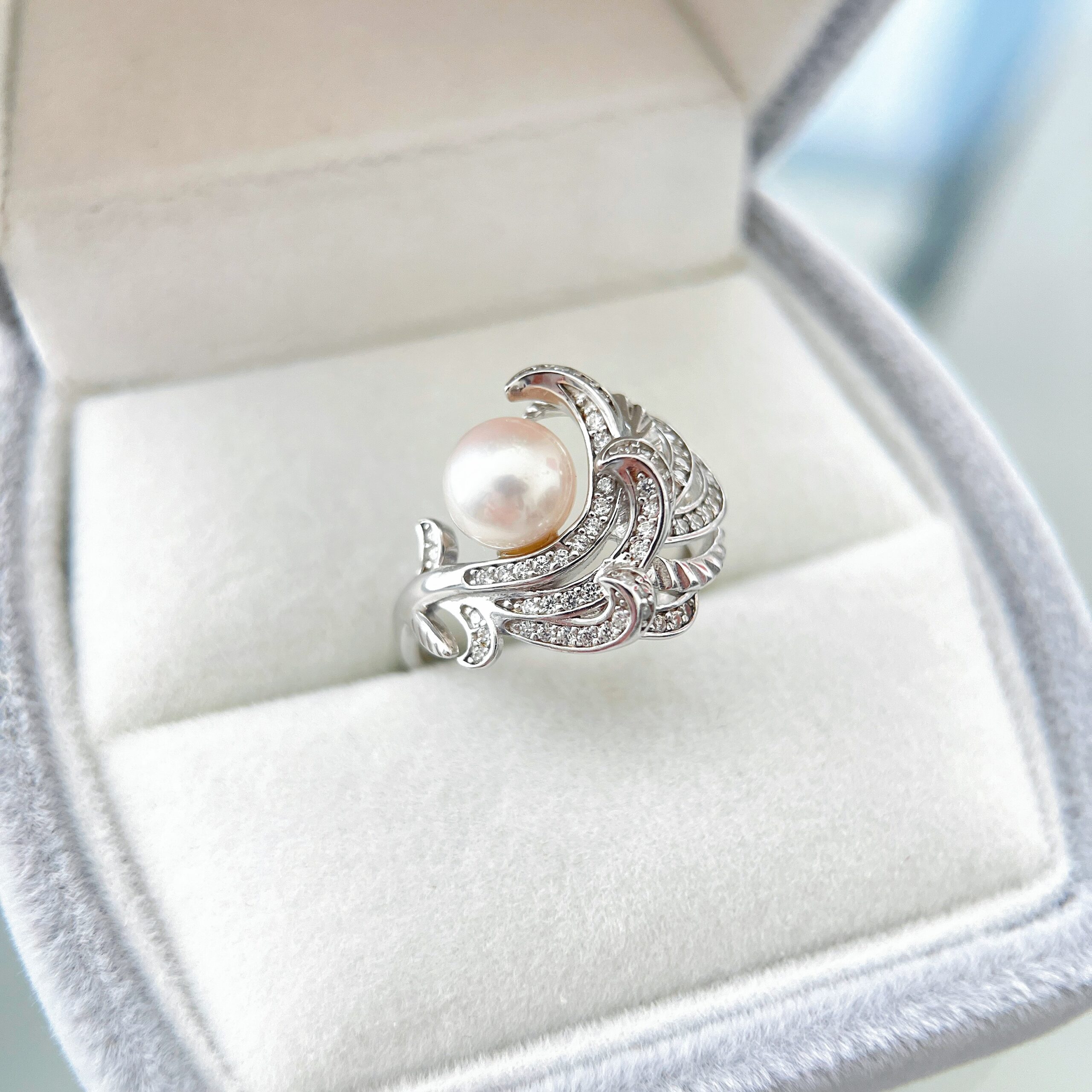 A refined statement piece inspired by blossoming petals touched by winter light. The Frosted Bloom Ring features a luminous 6–7mm freshwater pearl nestled within an ornate S925 silver floral setting, adorned with sparkling cubic zirconia for a soft, radiant shimmer.