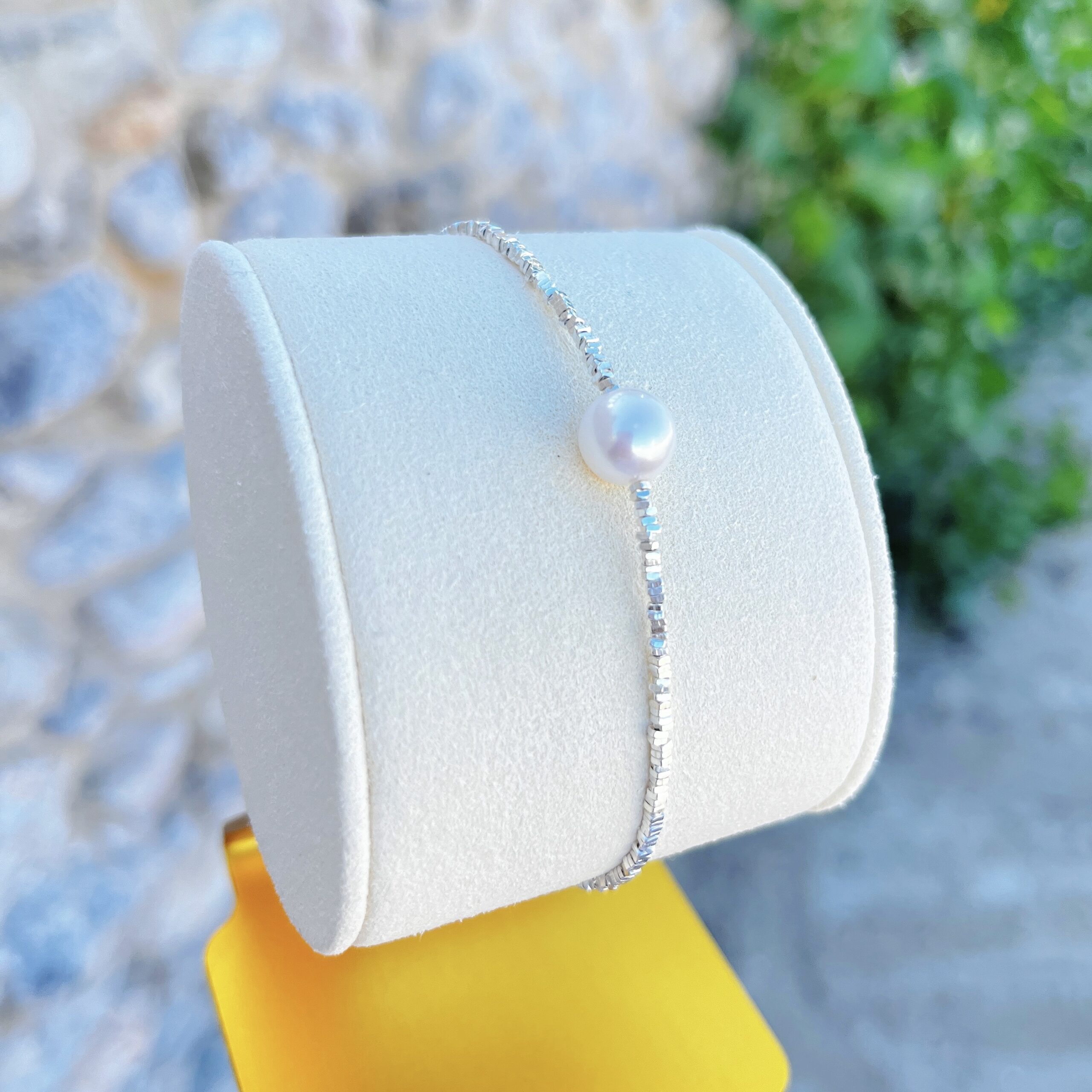 Crafted with faceted sterling-silver beads that glimmer softly on the wrist, the Astra Bracelet features a central 9mm white freshwater pearl — perfect round, serene, and luminous. Designed in 15cm + 3cm adjustable, it offers a comfortable, elegant fit and pairs beautifully with the Astra Choker or shines on its own as a subtle statement.