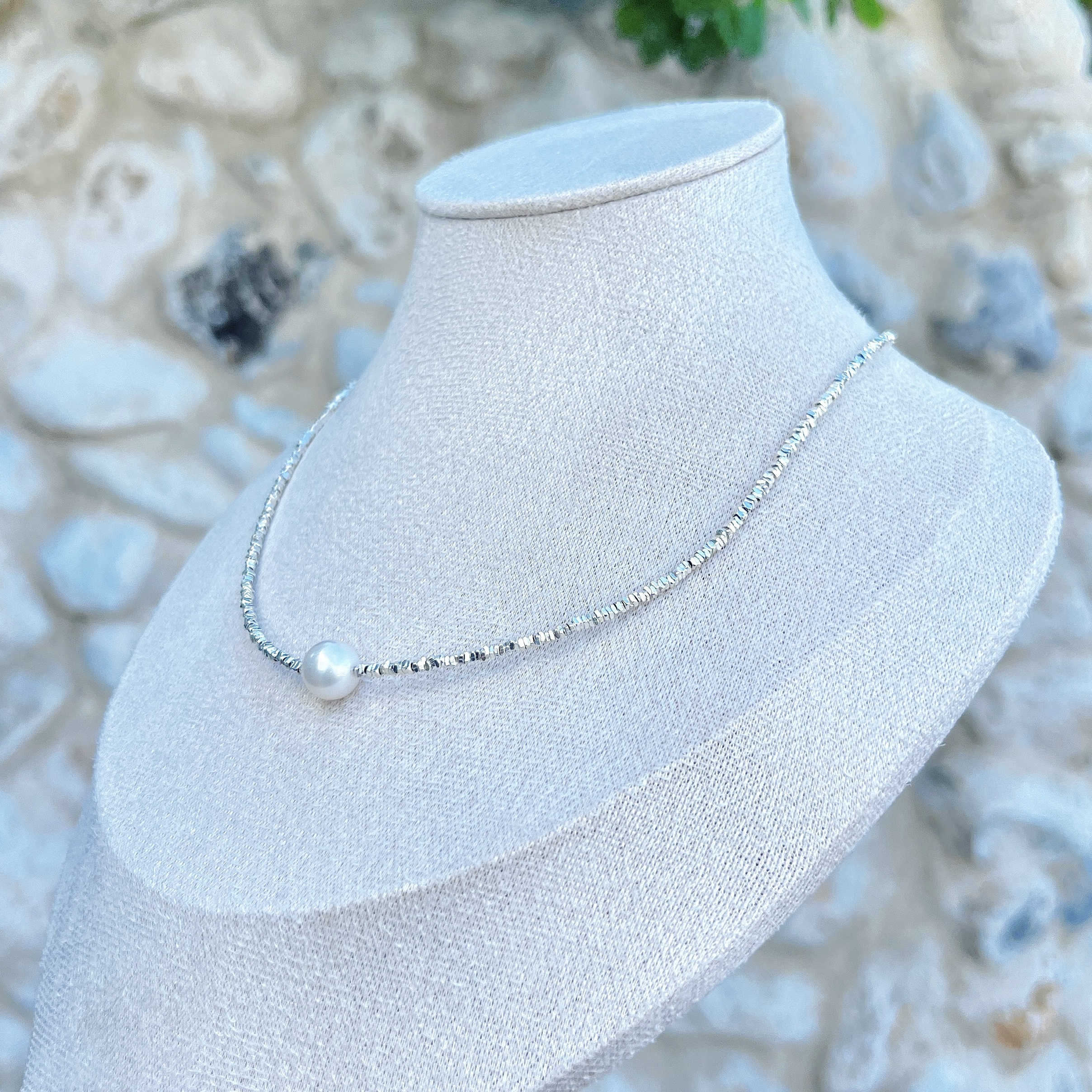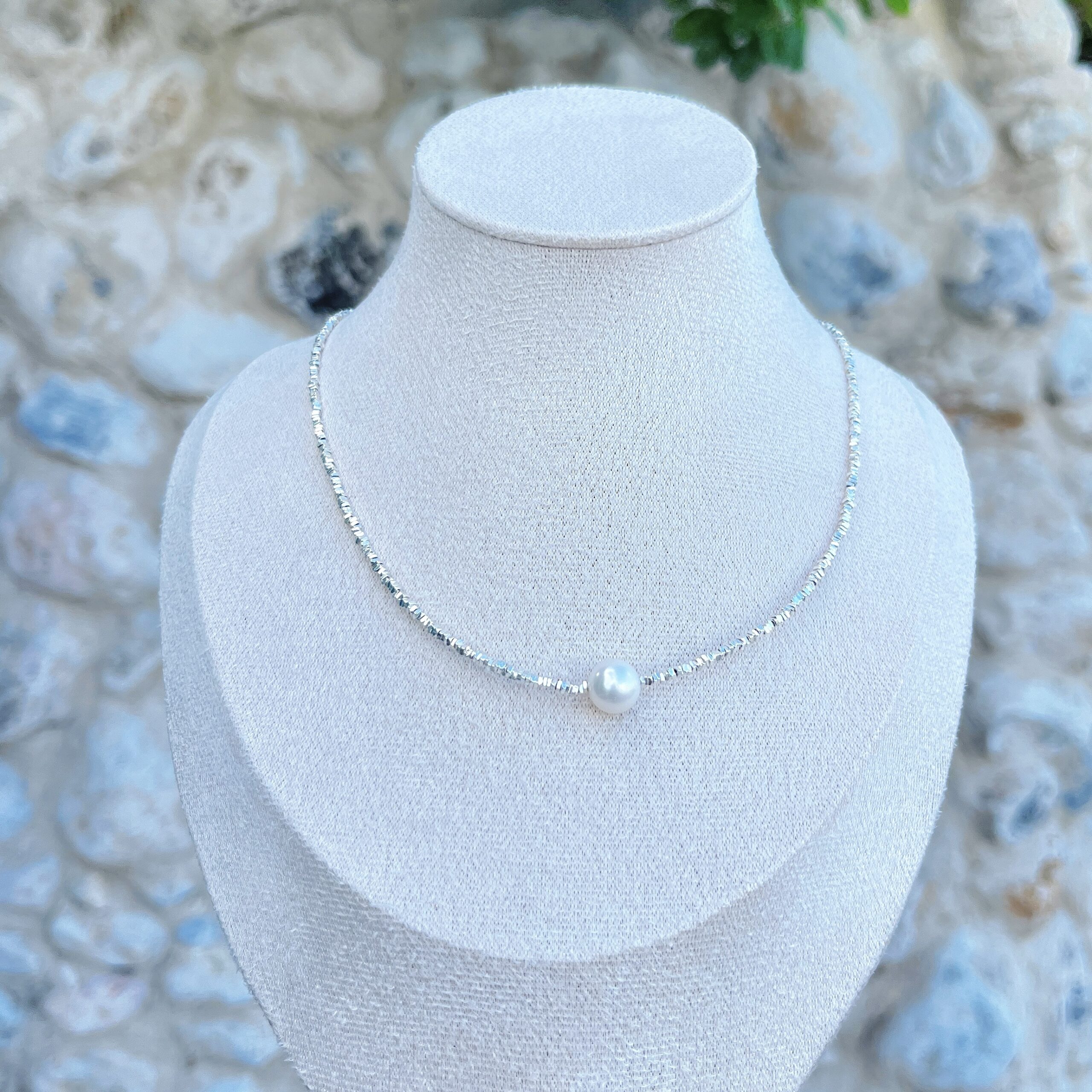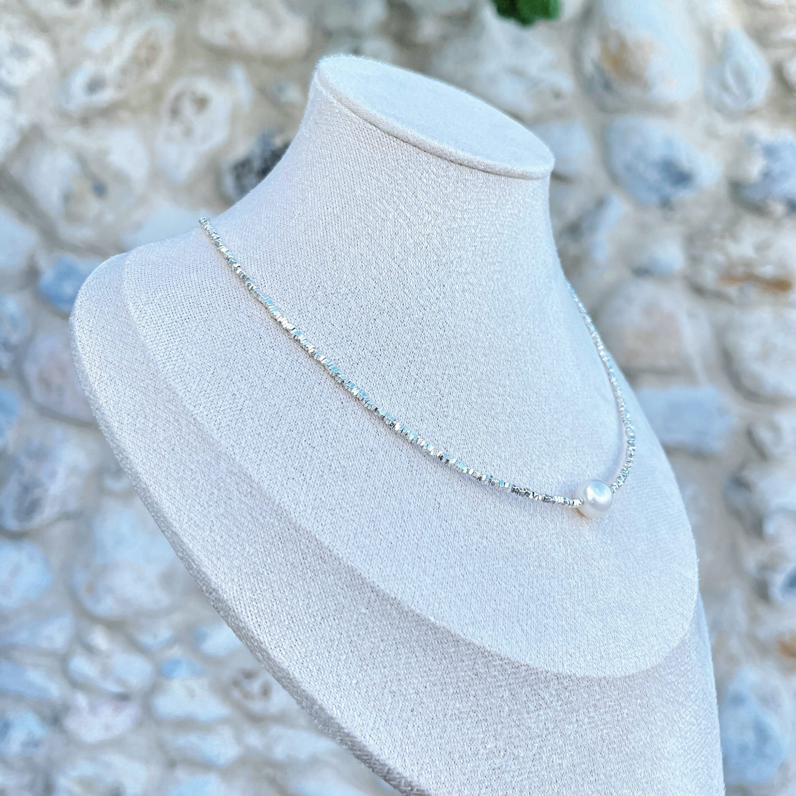 A luminous choker designed with faceted sterling-silver beads that shimmer like distant starlight, centered by a flawless 9mm white freshwater pearl — perfect round and radiant. At 36cm, the Astra Choker rests delicately along the collarbone, offering a refined glow that elevates every look with subtle sophistication.