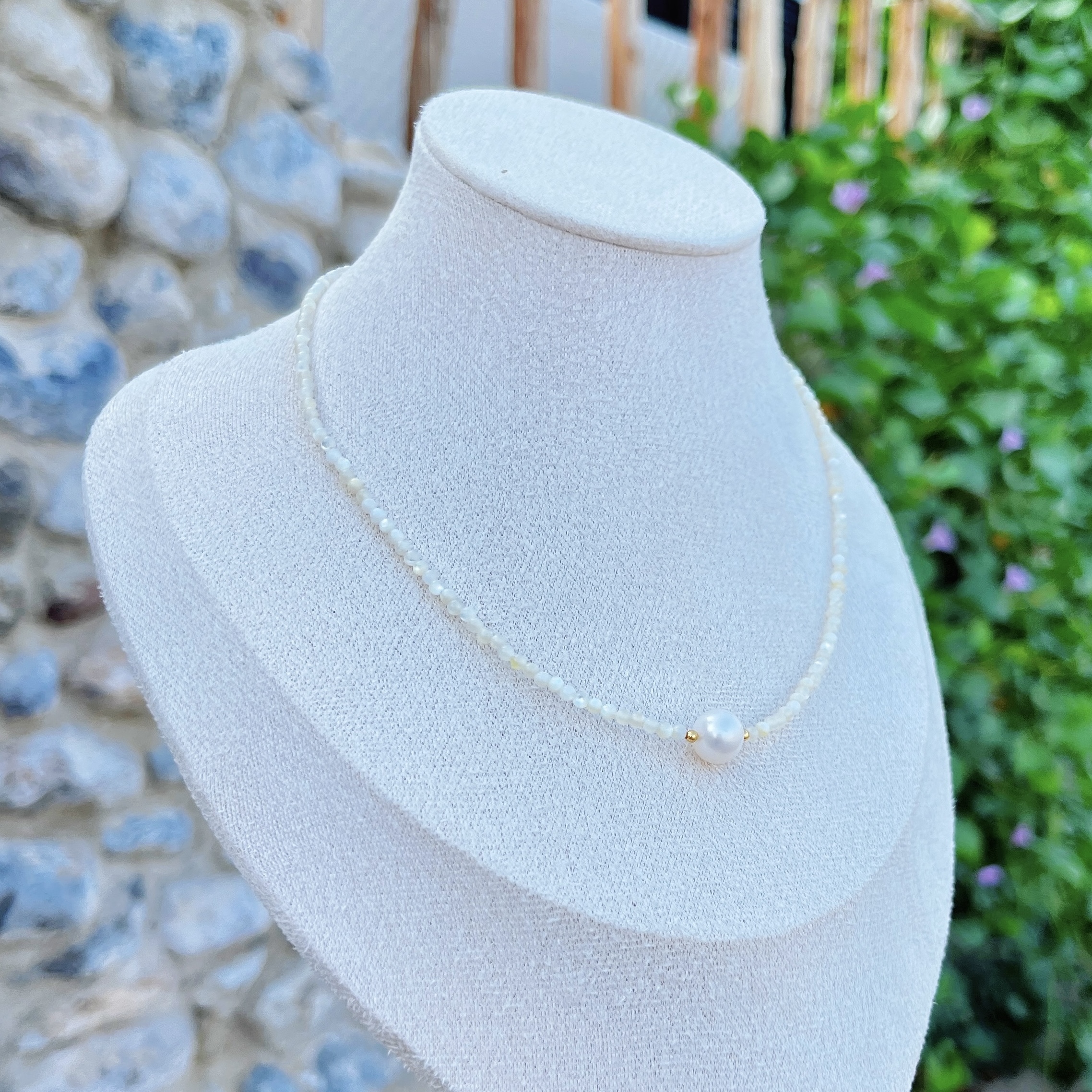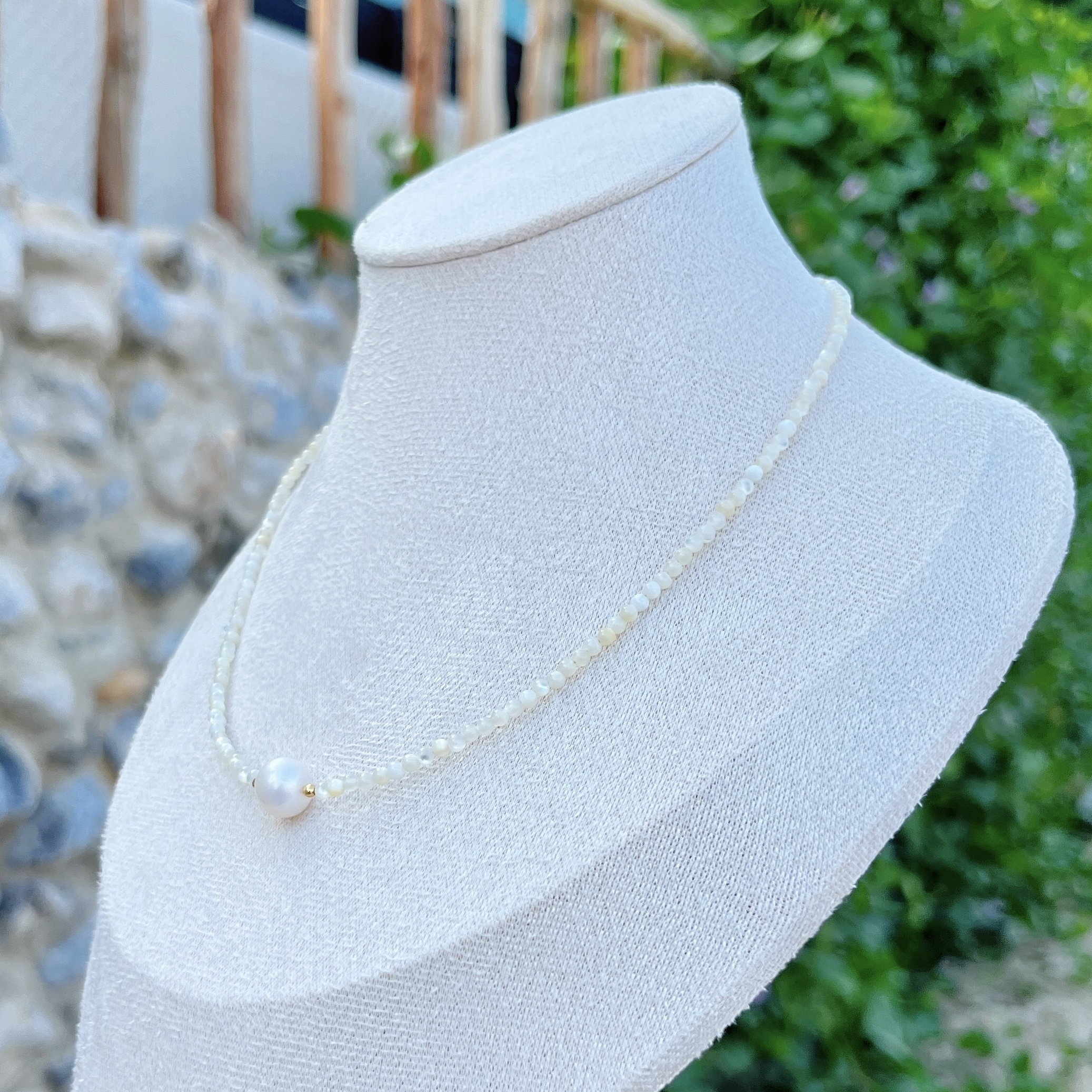 A serene choker crafted with 2mm white-lipped pearl oyster shell beads, offering a soft nacre glow that feels smooth and luminous against the skin. At the center rests a 9mm white pearl, gently radiant and perfectly balanced.