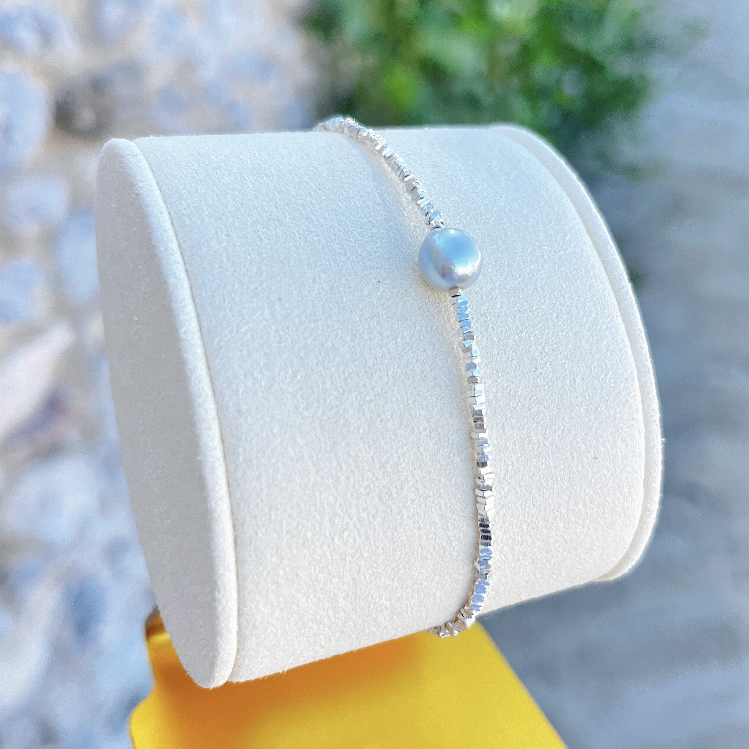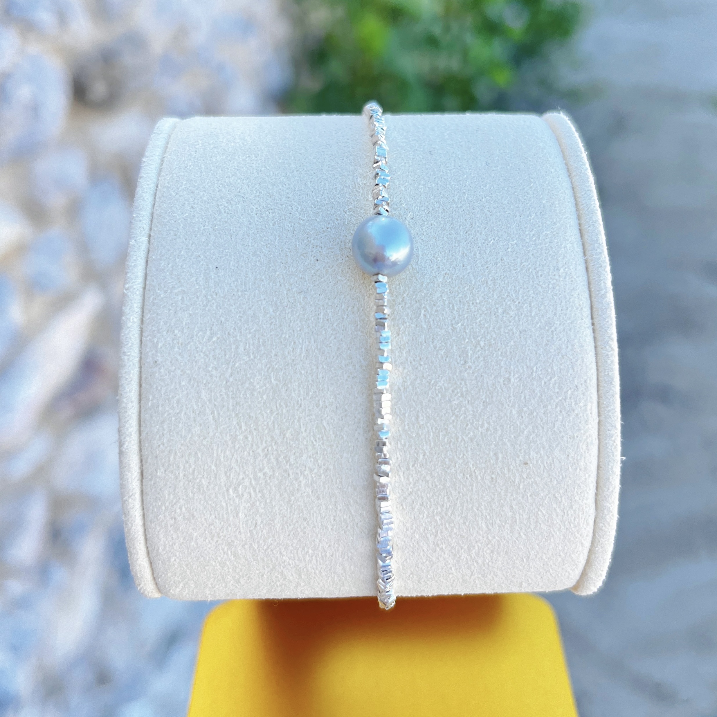 A delicate bracelet featuring a 5–6mm Japanese Akoya pearl with rare silver–grey toning, known for its cool brilliance and high lustre. The pearl’s soft metallic sheen pairs beautifully with faceted sterling-silver beads, creating an icy, refined shimmer across the wrist.