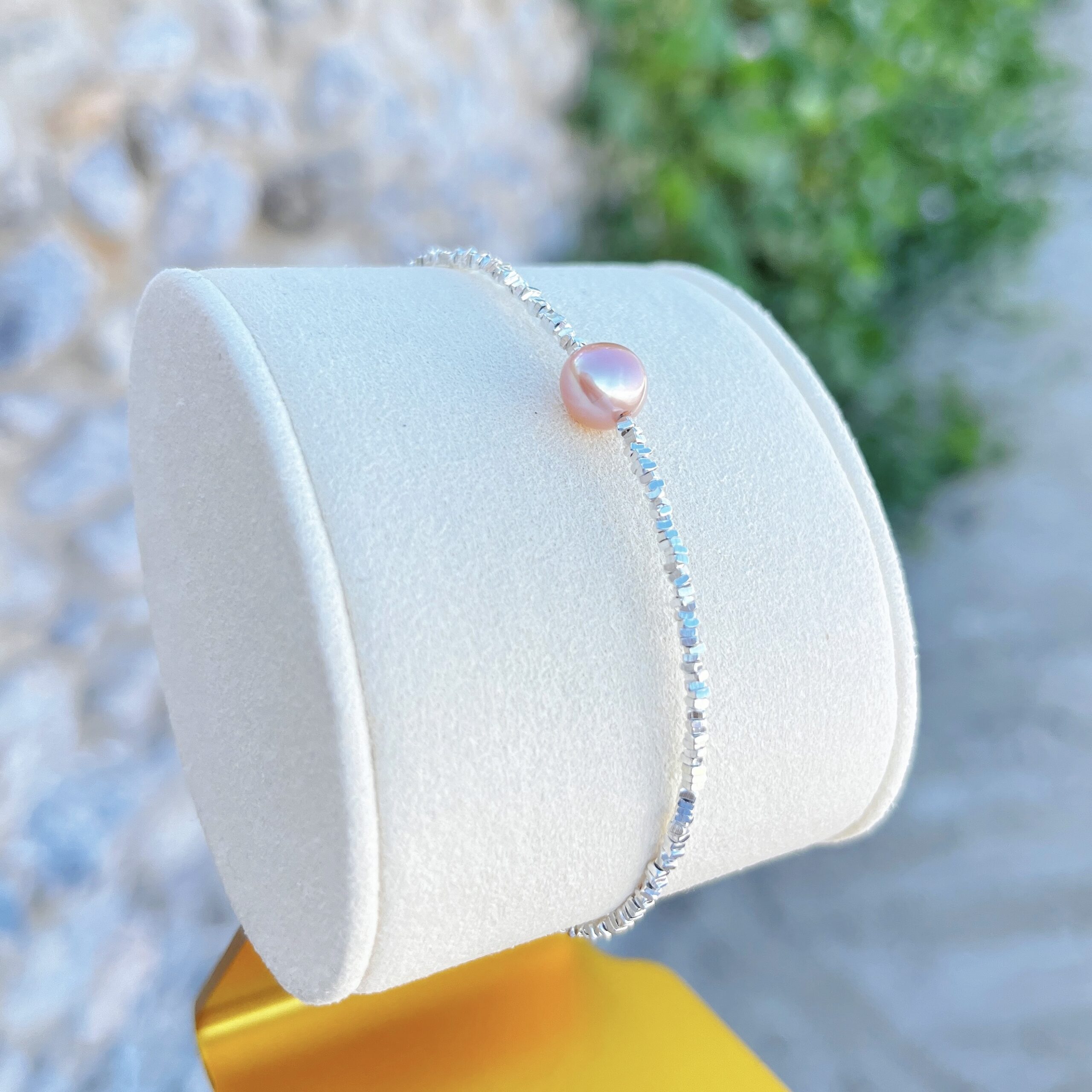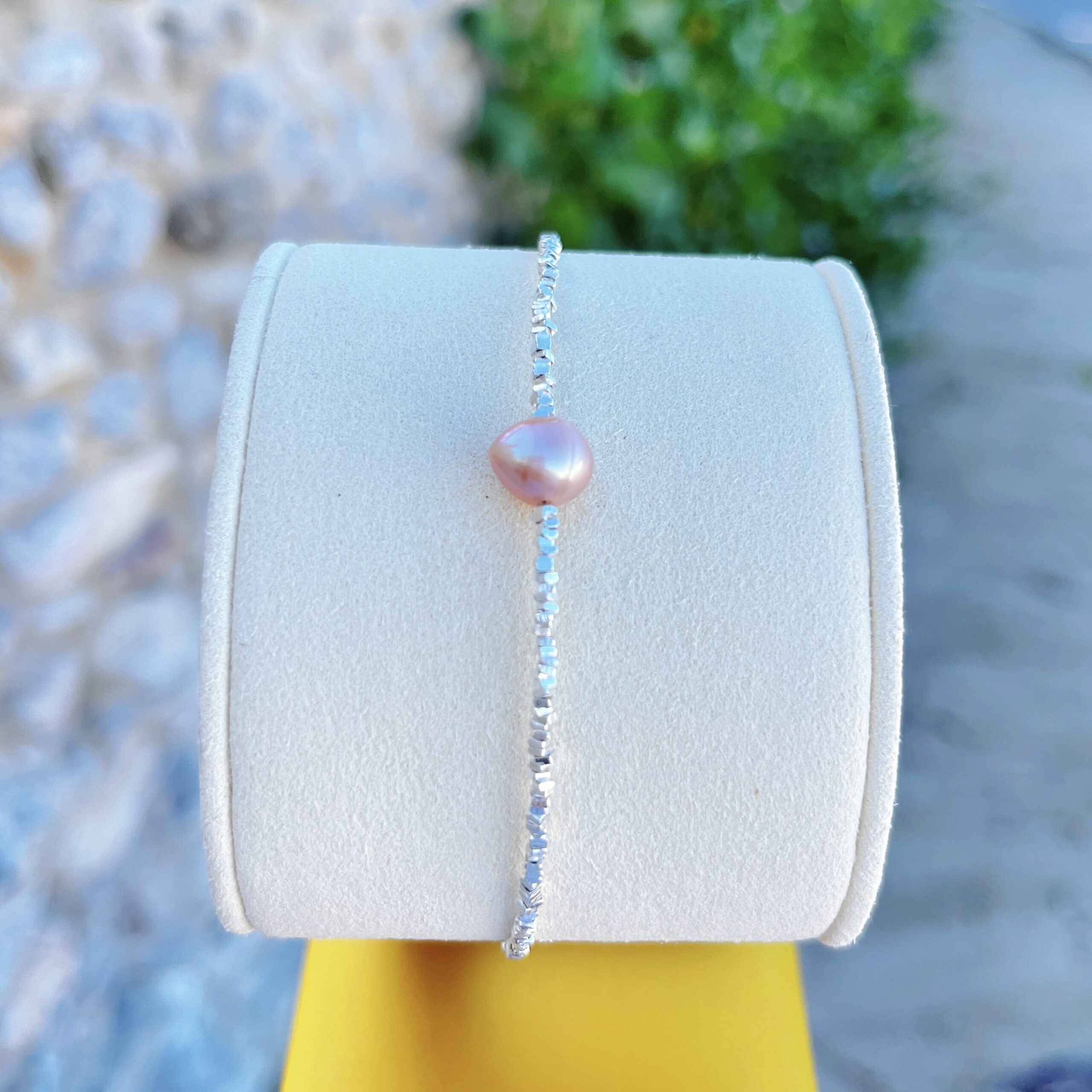 A delicate bracelet featuring a 6–7mm purple-toned freshwater pearl, glowing softly against faceted sterling-silver beads that shimmer with every movement. The gentle lilac tone adds a touch of dreamy elegance, making it perfect for layering or wearing alone. Designed in 15cm, the Viola Bracelet offers a refined, comfortable fit.