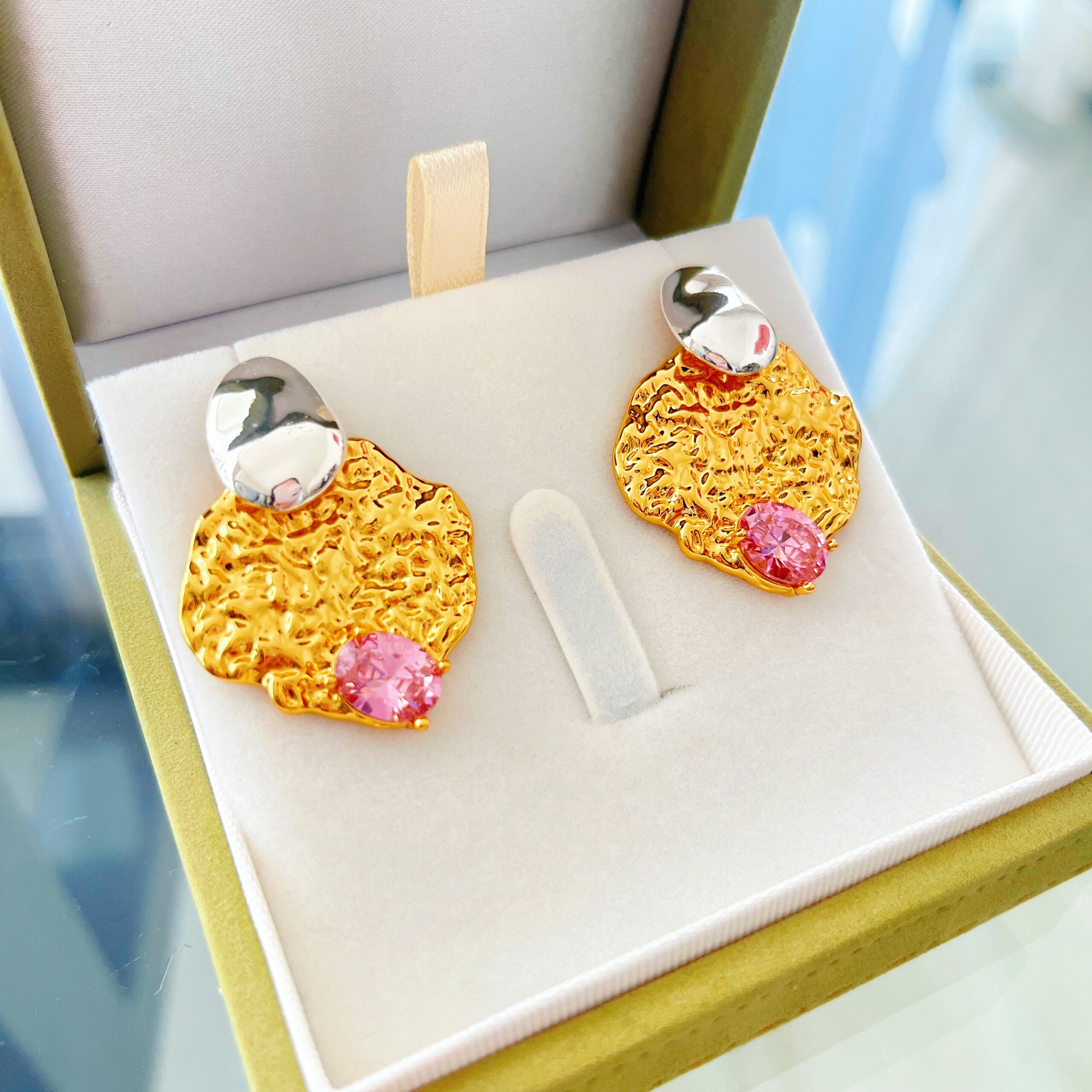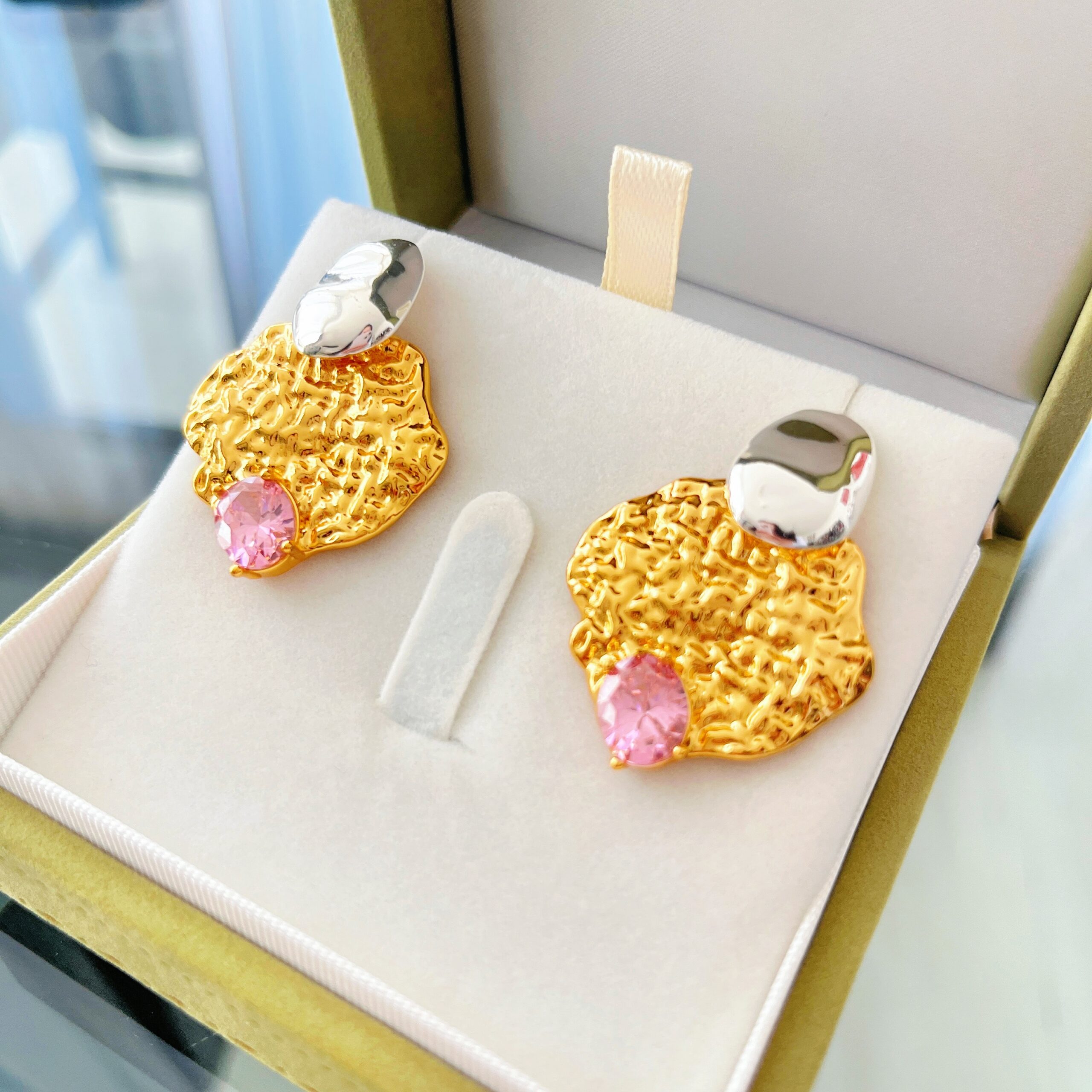 A sculptural statement of modern elegance — the Rosette Muse Earrings combine molten-textured gold with a sleek silver accent, finished with a brilliant pink stone that adds a soft, feminine glow.